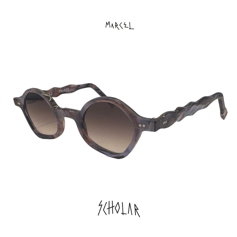 A frame born from curiosity and craft. Marbleized chocolate tones and a sculpted Wonka silhouette meet polished stainless accents and striking lenses to create a wearable sculpture with quiet presence. The mood is avant-garde and environmentally conscious, blending cutting-edge design with ecological responsibility for the fashion-forward collector seeking innovative luxury eyewear.