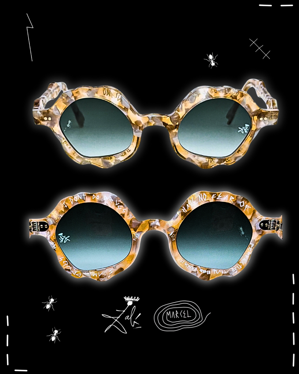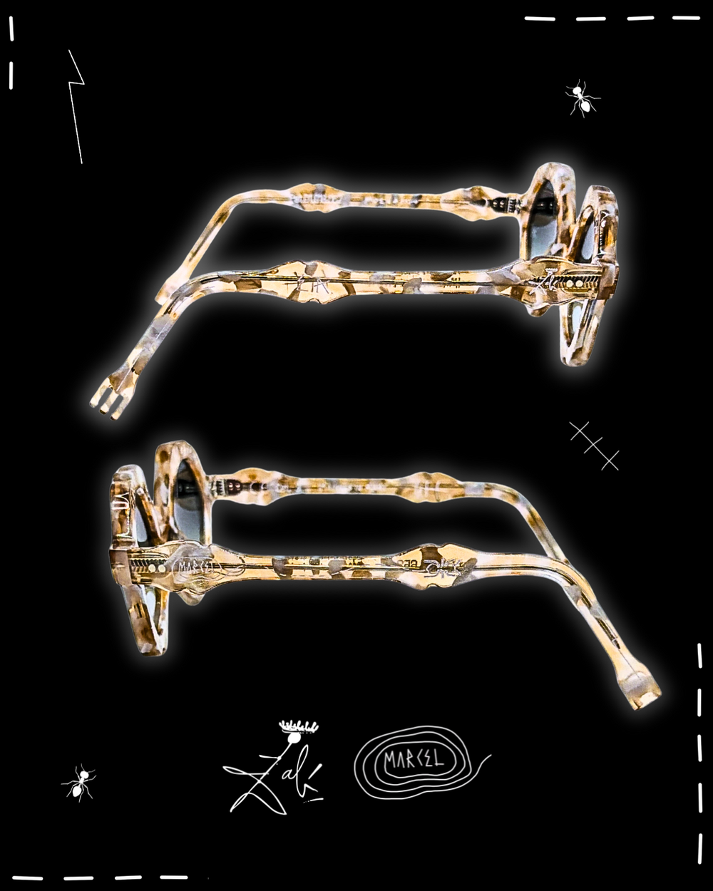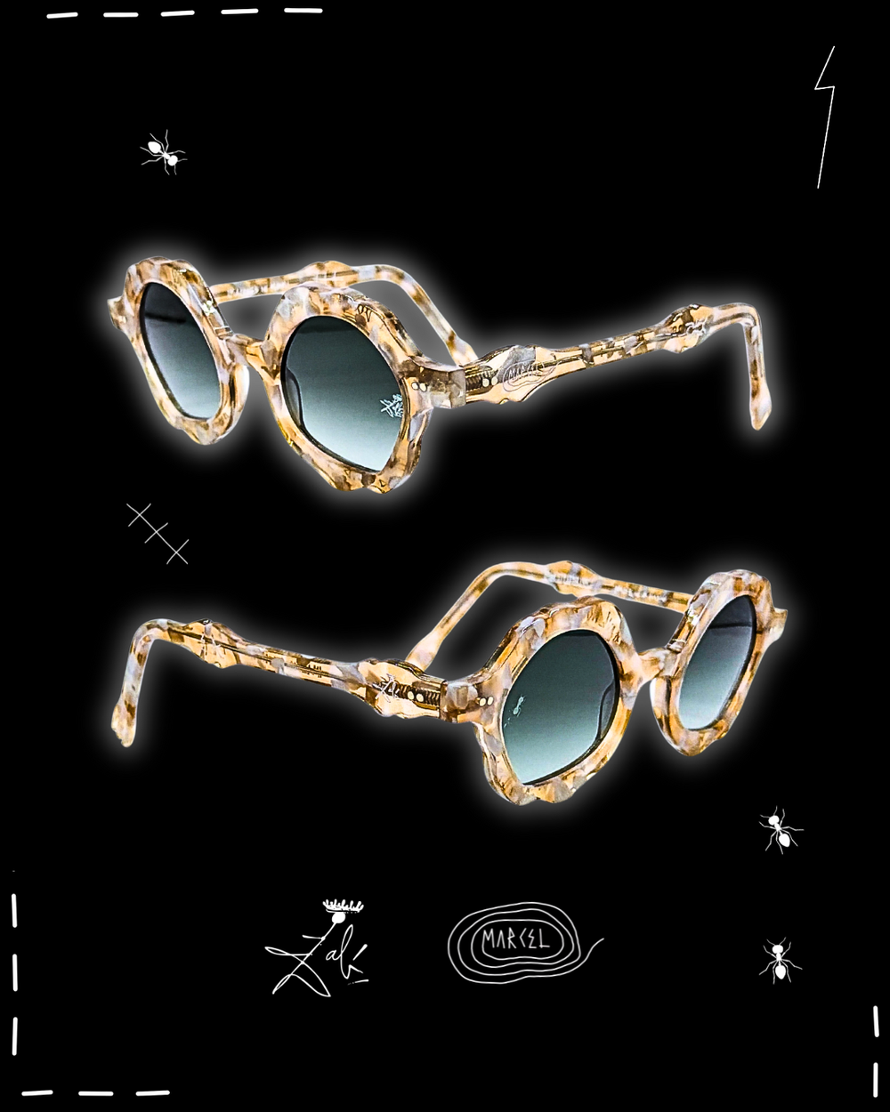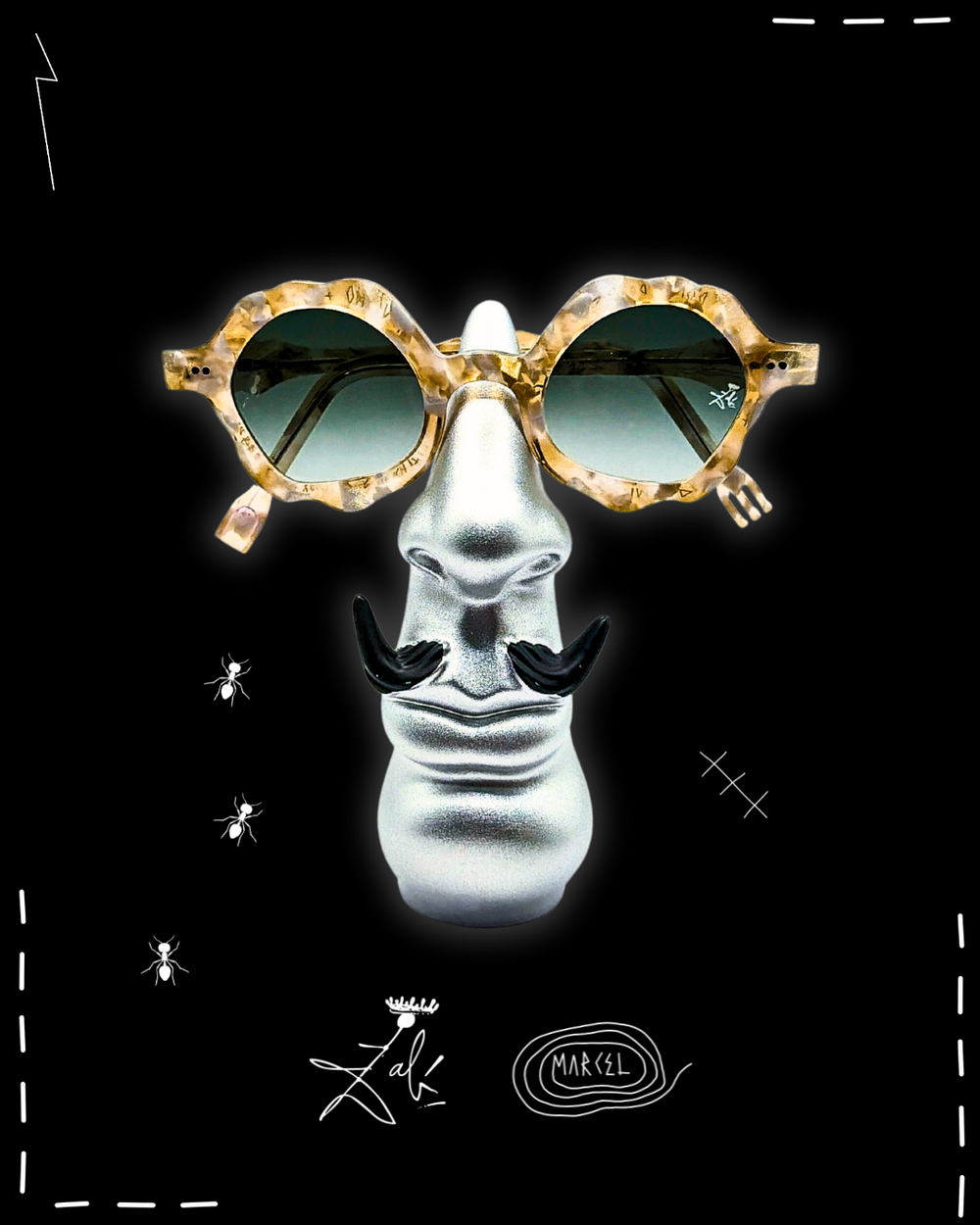 Dalí never used the ant as decoration. He used it like a warning flare. In his universe, ants arrive when something is too polished, too permanent, too convinced of itself. They crawl into the image as a quiet force of decay, dissolving the illusion of perfection and reminding you that time always wins. That is why Formica exists. I tied the ant to this frame as a ceremonial death of conventional eyewear. Not a trend shift, a burial. The end of safe shapes, safe taste, safe vision. The ant becomes the architect of transformation, eating away the old rules until something surreal is revealed underneath. What remains is not better eyewear. It is a new object with a pulse. Decay is the doorway. Decay is how the unreal enters the room.