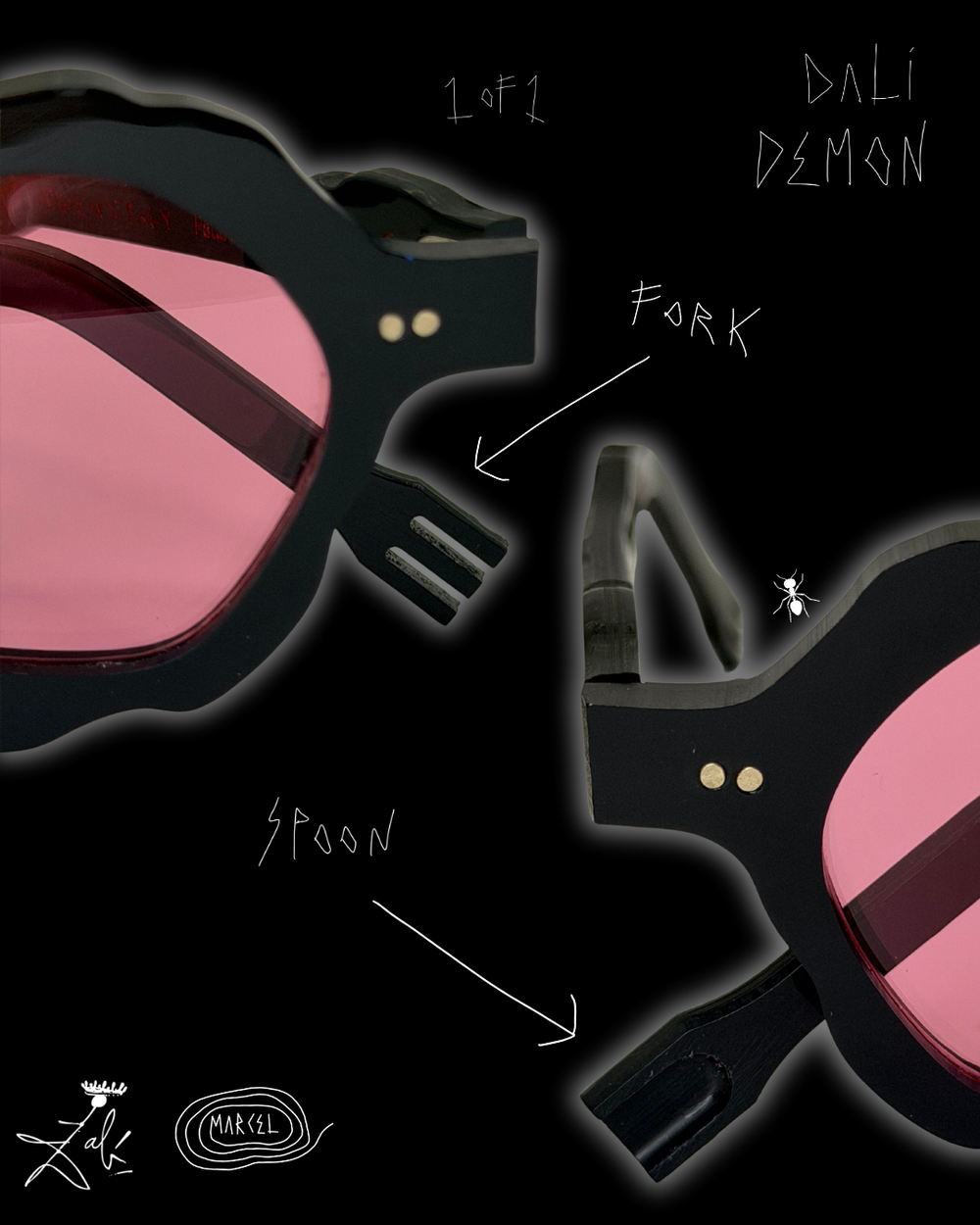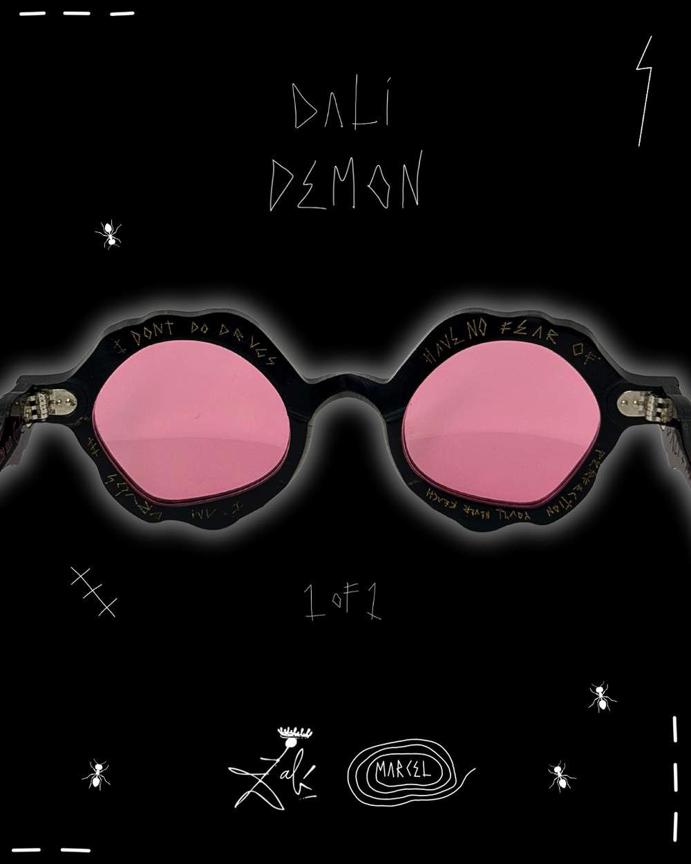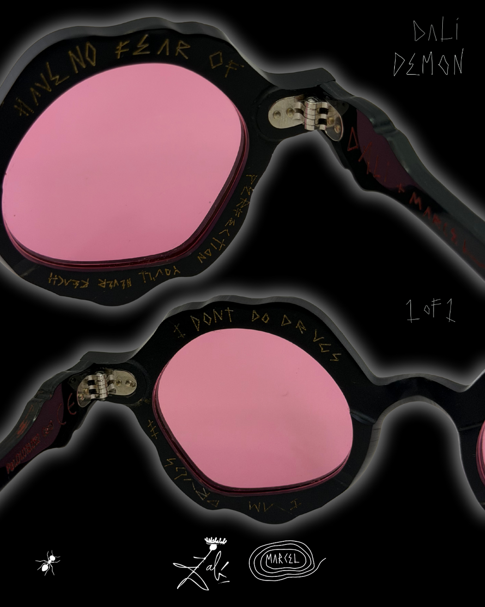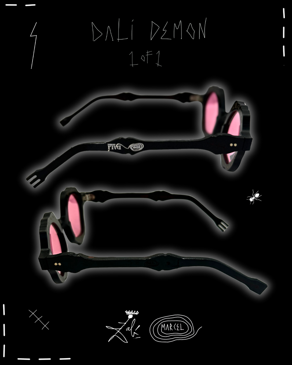 DEMON DALÍ exists outside the edition. A NOR / Black Formica with red lenses, carrying upside-down logos, incorrect typography, and red and gold writing applied by hand. The surface is intentionally rough, the frame and temples left unfinished, exposing process, hesitation, and decision-making normally erased from production.